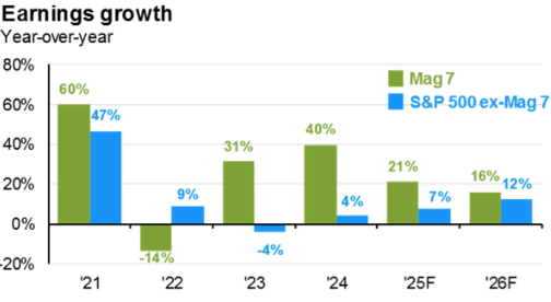 This outperformance of the Mag 7 is tied to these companies’ earnings growth relative to the rest of the companies in the index, so the outperformance may be warranted. If you look at the chart below, the spread between the earnings growth of the Mag 7 and the rest of the S&P 500 index has been declining. It remains to be seen whether this trend will continue, but if it does, maybe stock performance will broaden out and non-Mag 7 stocks could outperform.