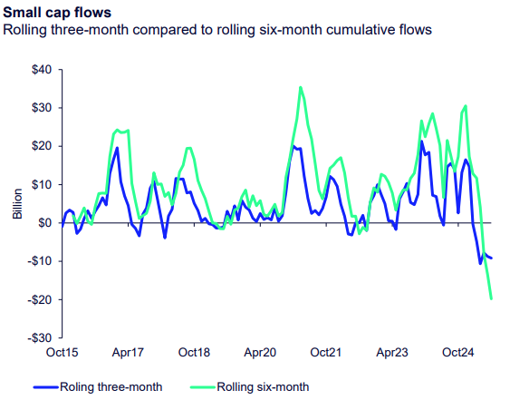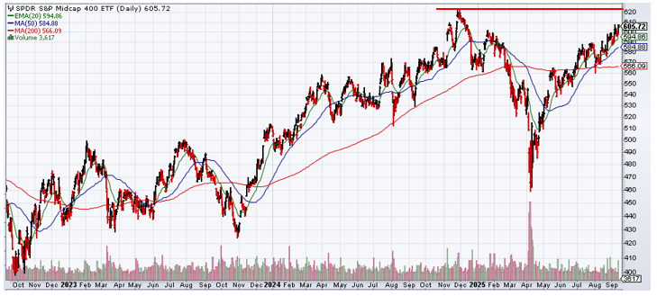 While large caps appear somewhat concentrated in performance due to the Magnificent 7, mid and small caps appear more reasonable and less loved. Small caps have been trailing large and mid caps this year as uncertainty on U.S. policy, the Fed and geopolitical tensions persist. Investors often prefer more clarity to fully embrace the potentially more risky and volatile small cap stocks.