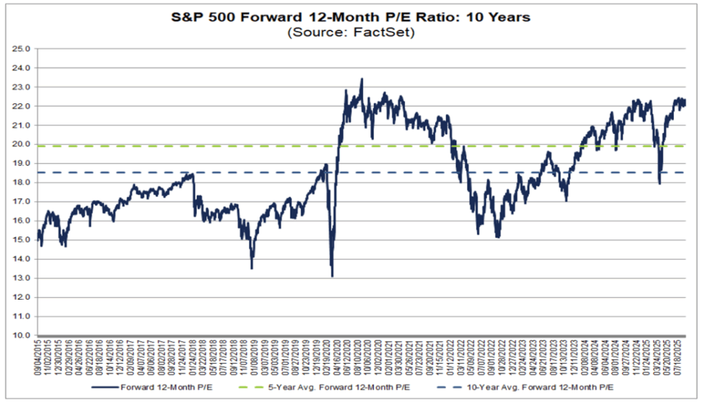 Looking at it another way, in the chart below, the forward price-to-earnings (P/E) ratio looks elevated relative to the last 5- and 10-years. Back in April, you can see that after the market decline, the forward P/E ratio hit the 10-year average. At those more attractive valuation levels, investors may have stepped in to buy, resulting in the subsequent rally from the April lows. Valuation-sensitive investors that were patiently waiting for those improved valuations to buy, were rewarded.