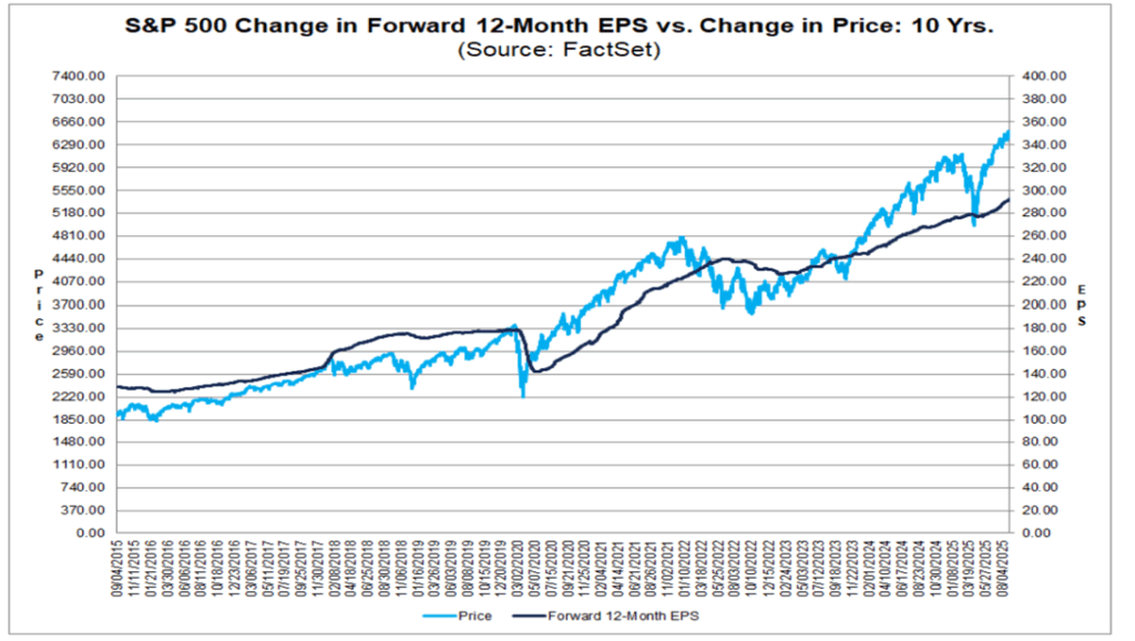 In the chart below, if you compare the 12-month forward earnings per share (EPS) growth (dark line) of the S&P 500 Index compared to the price (blue line) of the S&P 500 index, you can see that the valuation (blue line) has accelerated faster and higher than the earnings growth estimates. If you go back to April, you can see when valuations were more palatable as the light blue line (price) touched the darker line (EPS). If you go back further, you’ll see periods where price was below EPS, which could have been an indication that U.S. equity valuations were attractive.