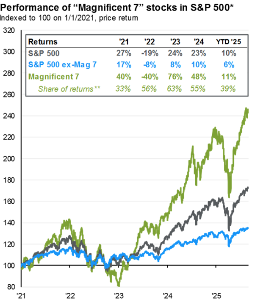 A good portion of the performance of U.S. large cap indices has been due to the strength of the “Magnificent 7” companies’ stocks. The Magnificent 7 are Alphabet, Amazon, Apple, Meta Platforms, Microsoft, Nvidia, and Tesla. As you can see below, this group of stocks have materially outperformed the rest of the stocks in the S&P 500 since the beginning of 2021.