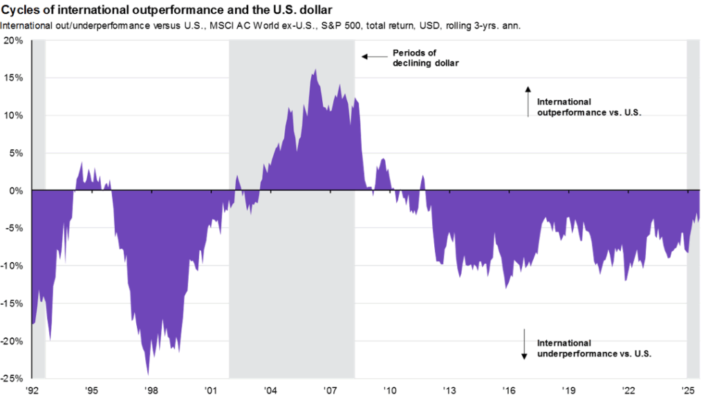 Historically, there have been periods where U.S. equity markets outperformed foreign equities, and vice versa. As you can see in the chart below, we have been in a period of U.S. dollar strength (foreign currency weakness) and U.S. equity outperformance (a good portion due to the strength of U.S. technology-related stocks). The question now is whether or not we are entering a more sustained cycle of foreign currencies and foreign stocks outperforming the U.S.