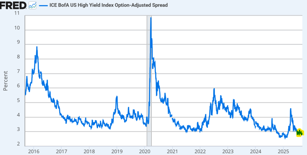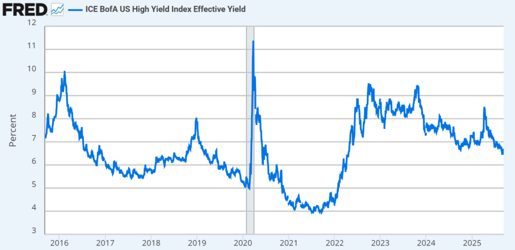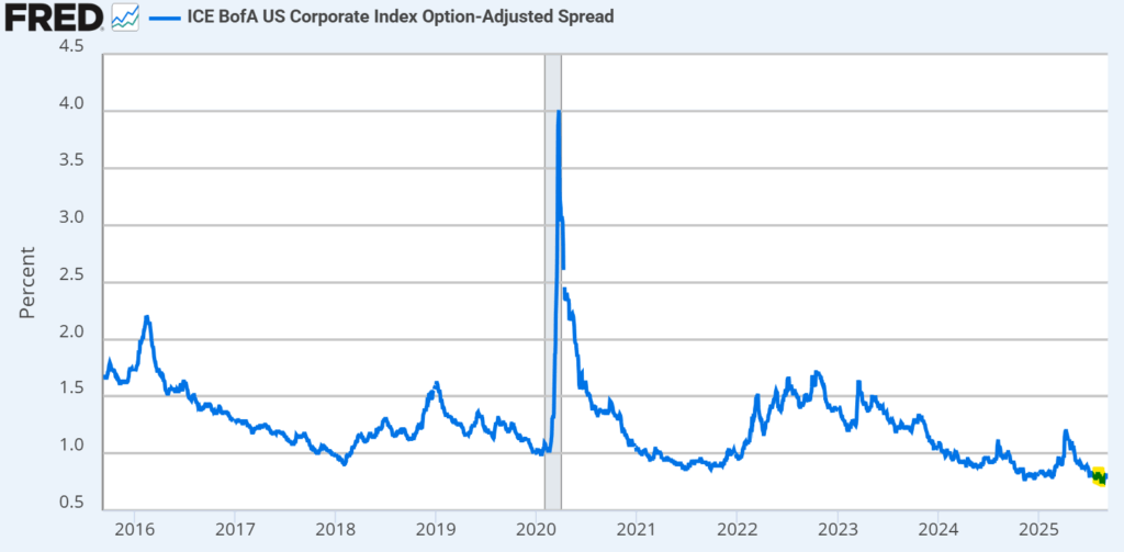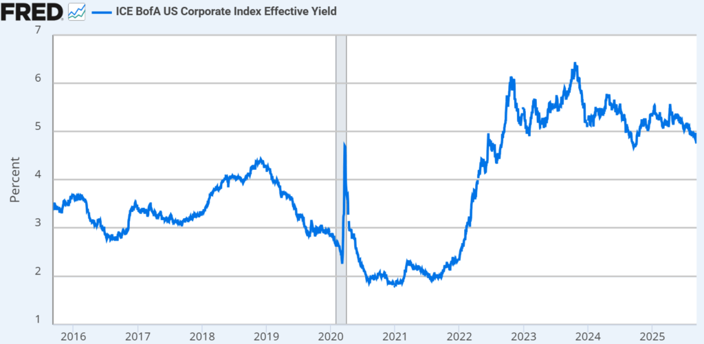 Source: Ice Data Indices, LLC, ICE BofA US Corporate Index Effective Yield [BAMLC0A0CMEY], retrieved from FRED, Federal Reserve Bank of St. Louis; https://fred.stlouisfed.org/series/BAMLC0A0CMEY, September 9, 2025.