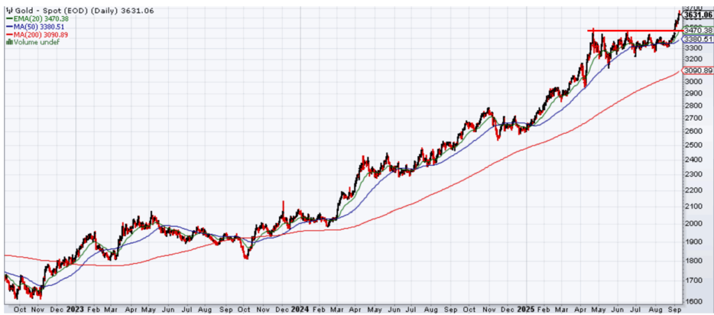 Gold prices had a period of consolidation from April through the end of August as gold bumped up against technical resistance at its prior April highs. This allowed other technical indicators to catch up, as seen in the price chart of gold below and the rising 200-day moving average (thin red line) below providing a potential floor under gold prices.