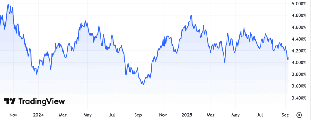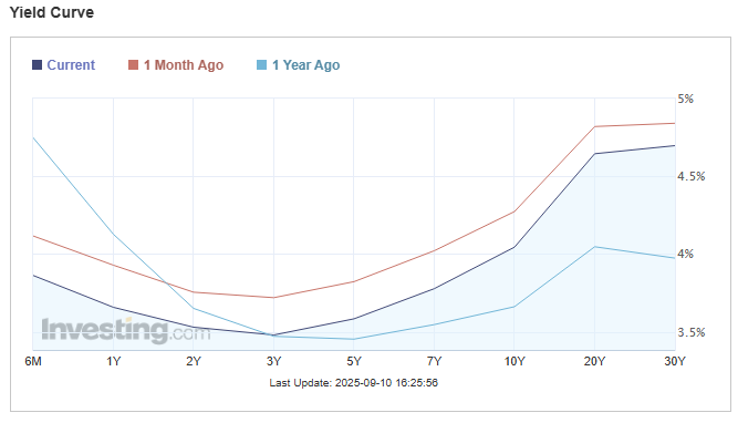 With the 10-year Treasury yield at roughly 4% as of September 10th, I remain slightly bullish on U.S. Treasuries at this time. If the economy really starts to weaken and markets price in further rate cuts, the yield curve could shift down, interest rates decline and interest rate-sensitive bond prices could rally. If the yield curve jumps back up higher to the top of its range, I would consider becoming increasingly bullish on Treasuries and duration at that time.