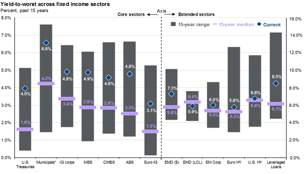 As you can see below, bonds across sectors are paying roughly 5% or more, with higher yields available the farther you go out on the risk spectrum (high yield, loans, emerging markets debt).