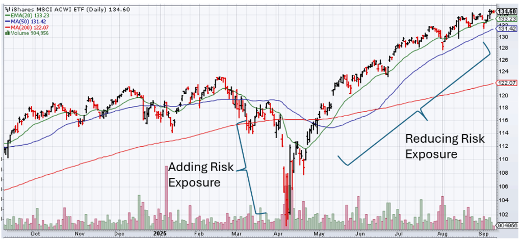 The image below is the exchange traded fund that tracks the MSCI ACWI Index, an index that tracks the performance of stocks from developed (U.S. and foreign) and emerging countries around the world. This is just a simplified illustration of how I added exposure to risk assets throughout the downturn and have been reducing exposure to risk assets as the markets rallied. My increased/reduced exposures were across leveraged U.S. and international equity positions as already described in this posts and my previous posts on Kulwicki Insights.