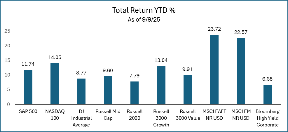 Risk assets continued to perform well, with U.S. and international equities and high yield bonds generating strong returns year-to-date. Those investors that have been diversified into international equities this year have been rewarded. The outperformance of international equities relative to U.S. equities has been welcomed after materially underperforming U.S. equities for several years.