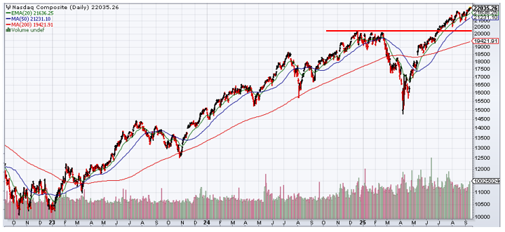 The NASDAQ 100 Index trades similar to the S&P 500, with the prior highs (thick red line) and a rising 200-day moving average (thin red line) below that.
