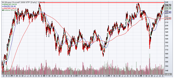 The Russell 2000 Index, which measures the performance of U.S. small caps (proxied by the iShares Russell 2000 ETF in the chart below) is approaching its prior highs, which currently acts as technical resistance (thick red line). If the index can break above that resistance level going back to 2021, small caps could catch a stronger bid by technical traders and push small caps higher.