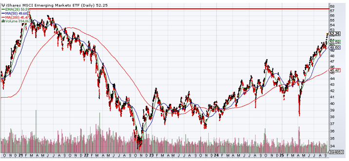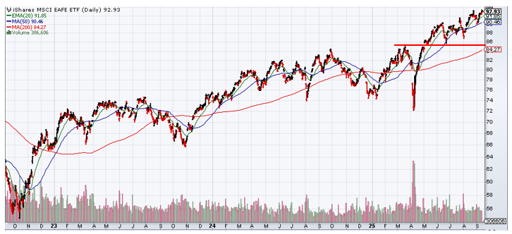 The MSCI EAFE Index (proxied by the iShares MSCI EAFE ETF in the chart below) remains in a bullish uptrend, with support levels at its breakout level from prior highs (thick red line) and with a rising 200-day moving average (thin red line).