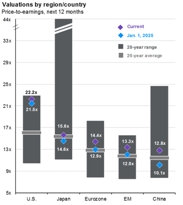 As you can see from the chart below, valuations outside of the U.S. have extended higher than what they were at the beginning of the year. You’ll also notice that these foreign equity markets’ valuations still remain at a discount to the U.S., potentially continuing to provide an opportunity for valuation-conscious investors.